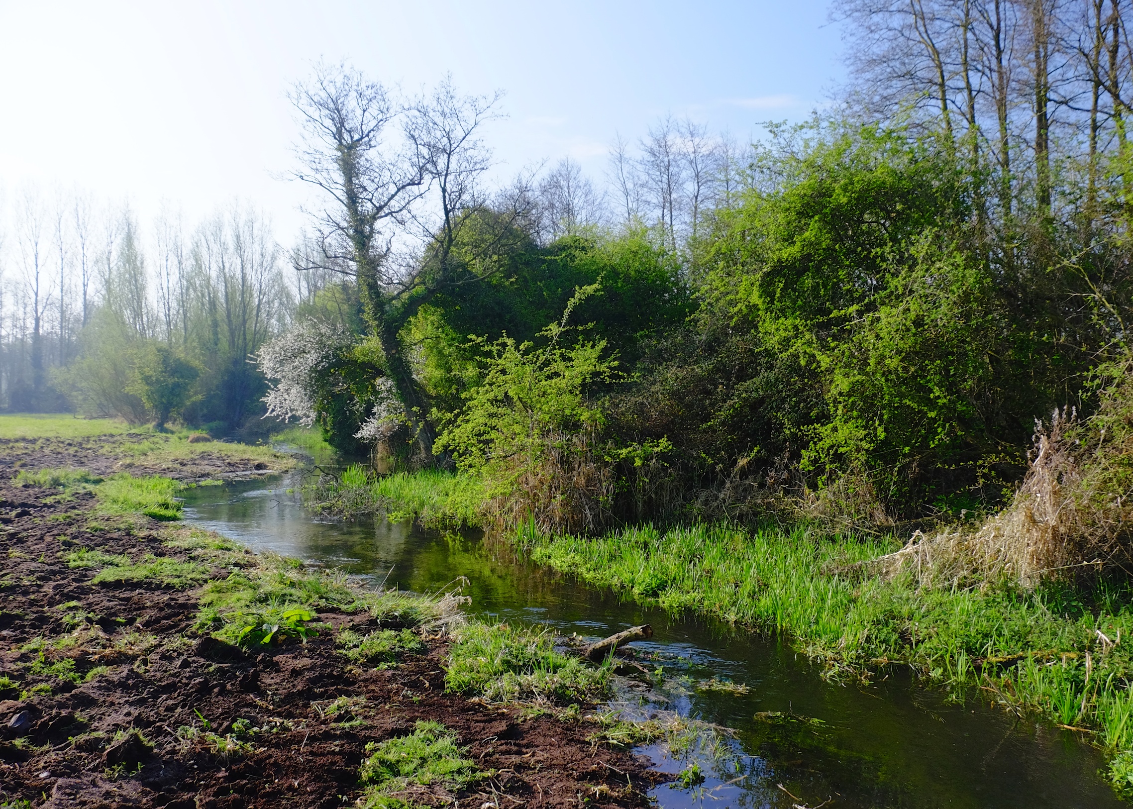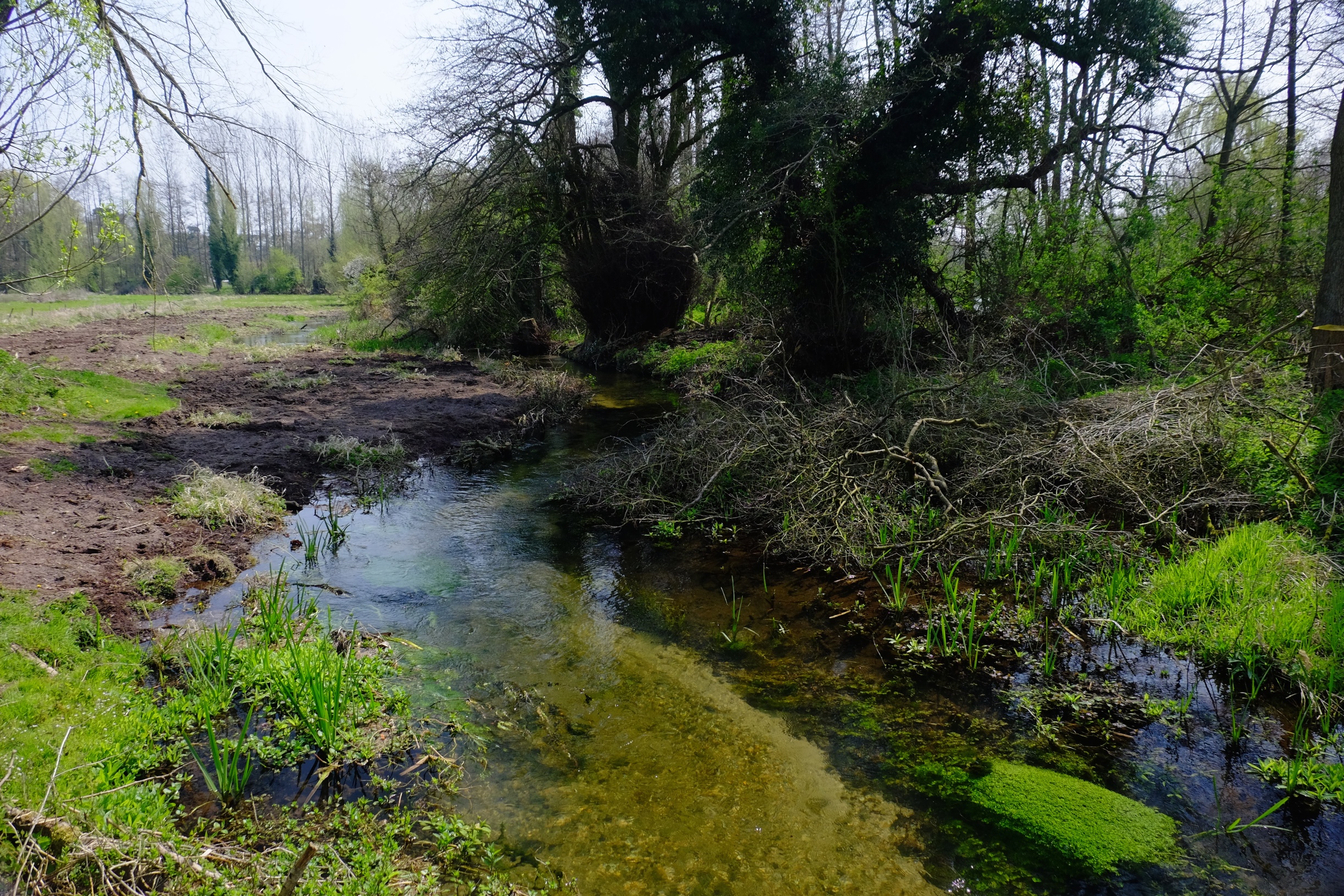 This final phase was a highlight because for a short reach (about 500 meters) we were able to re-shape those hideous levéed banks built up by years of dredging and re-create the flat riverside flood-plain and soft riparian margin that is the life-system of a ‘natural’ chalk-stream. Elsewhere the woody berms are accomplishing the same trick within the confines of a steeper-edged and relatively immovable modified channel. But here we had room to move. There were no gas-pipes, no ancient priories, no invaluable trees, no mill-leats or water-meadows. It was so satisfying to rebuild those meanders and to watch the landscape open up again.