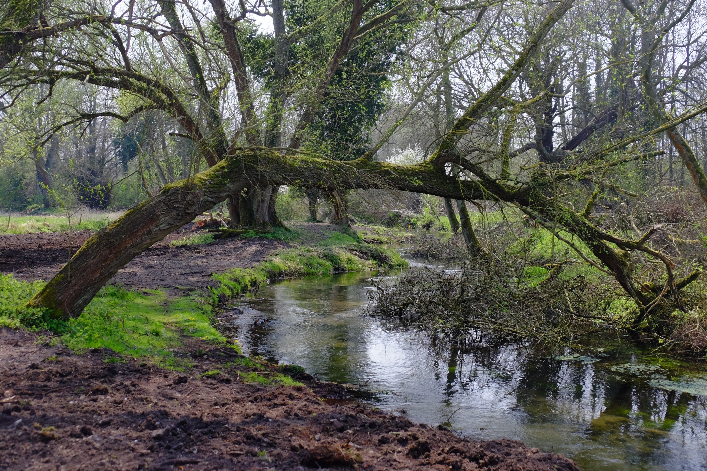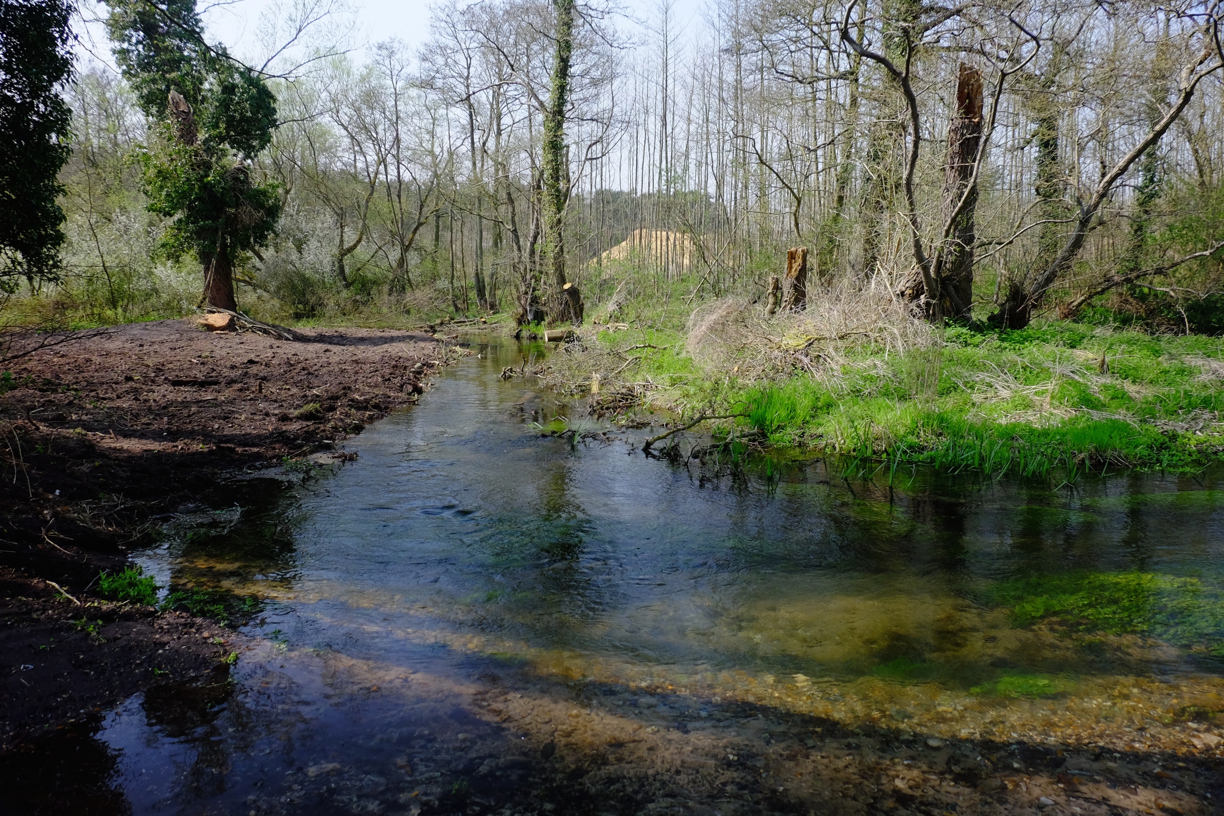 The three phases of the work therefore tackled each of these issues in turn. Selective felling and thinning opened holes in the leaf canopy above. The felled trees were arranged to create berms on one bank or the other, easing the river into the meander pattern that it would otherwise have spent the next few centuries re-creating, and finally the levées were regraded down into the berms along the near-side bank, leaving those on the far bank to work as sediment traps which will accrete over the next few years to become new river banks.