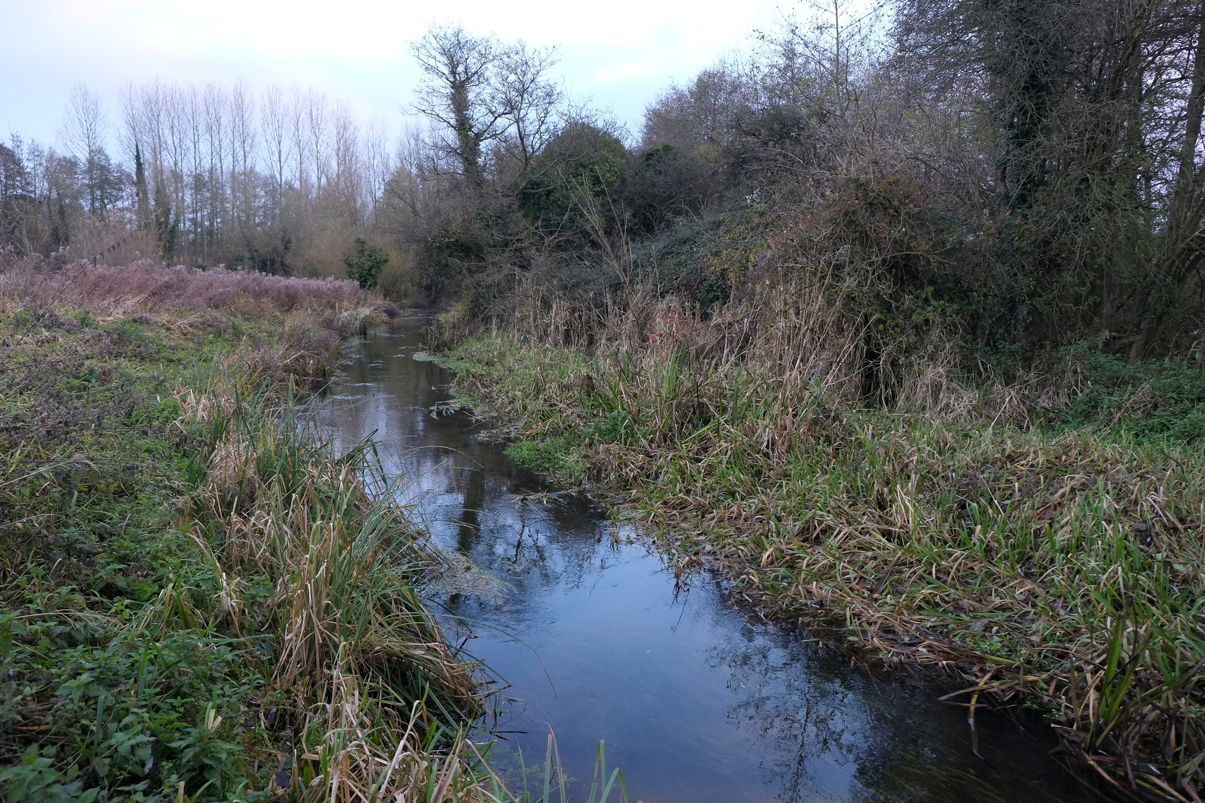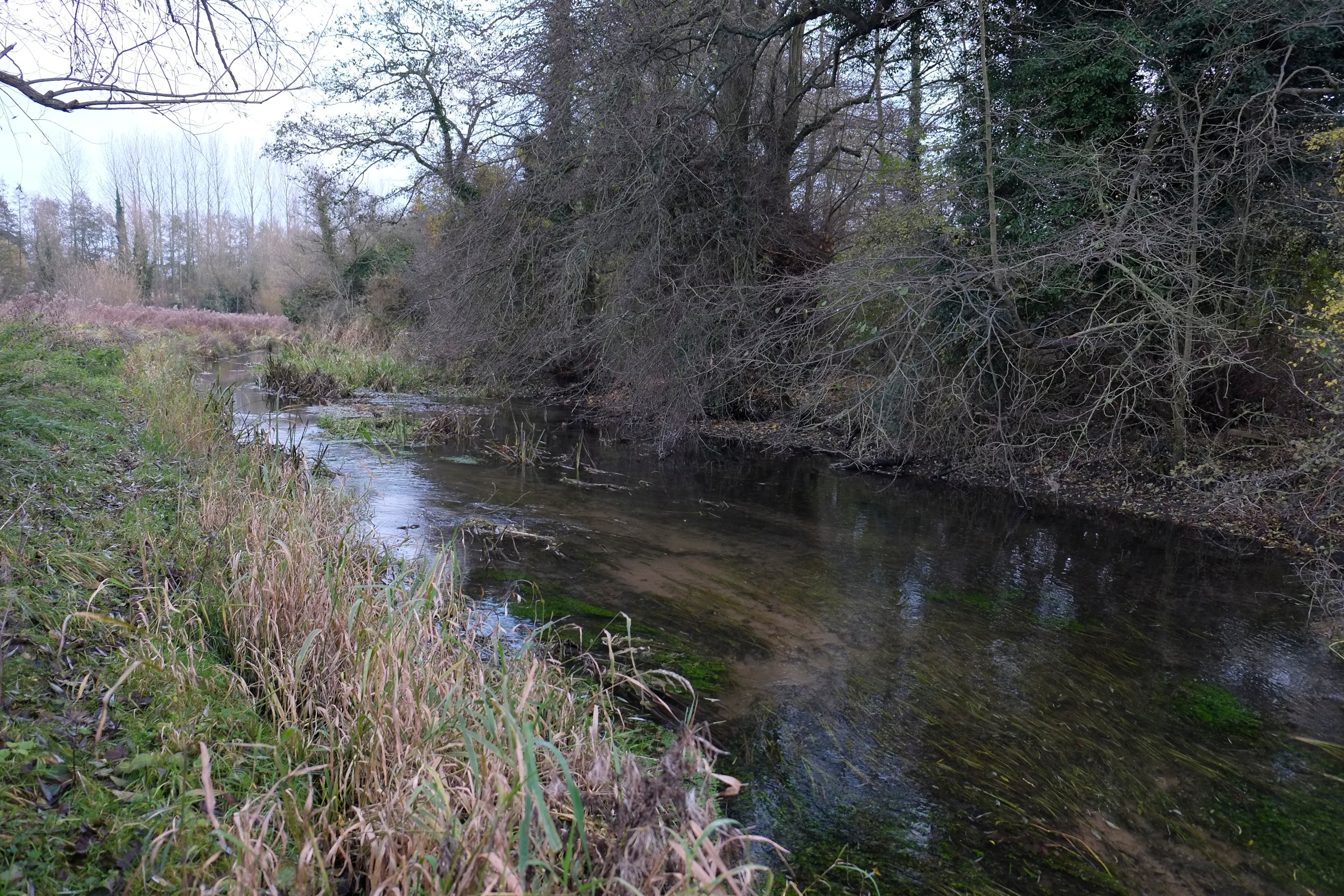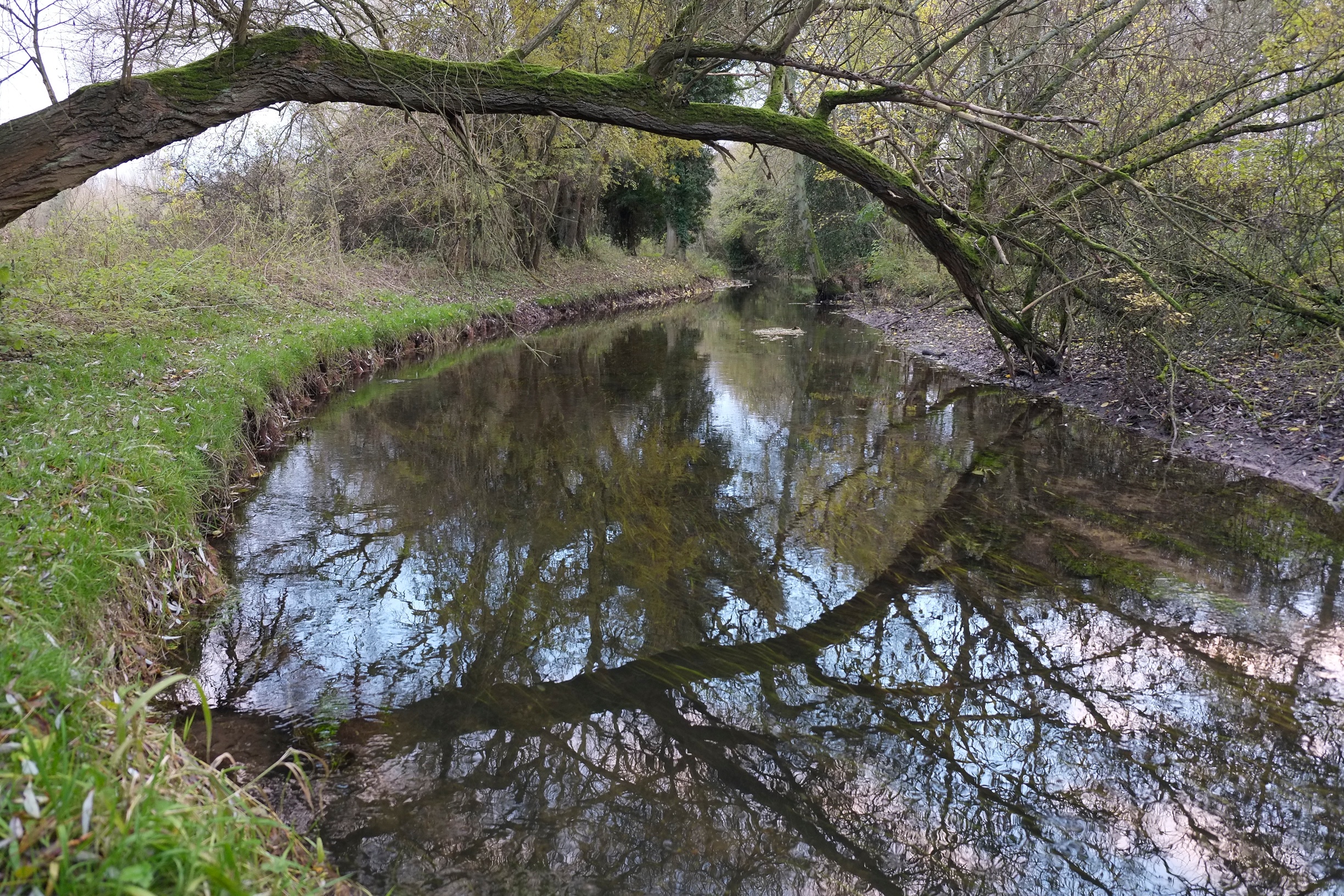 The pictures below tell a better story than words can. But as you look at them notice the steep, and soullessly straight near-side bank in the earlier images, the trough-like channel that has been dug far too deep and the extent of over-shading in a man-made woodland that had gone feral.