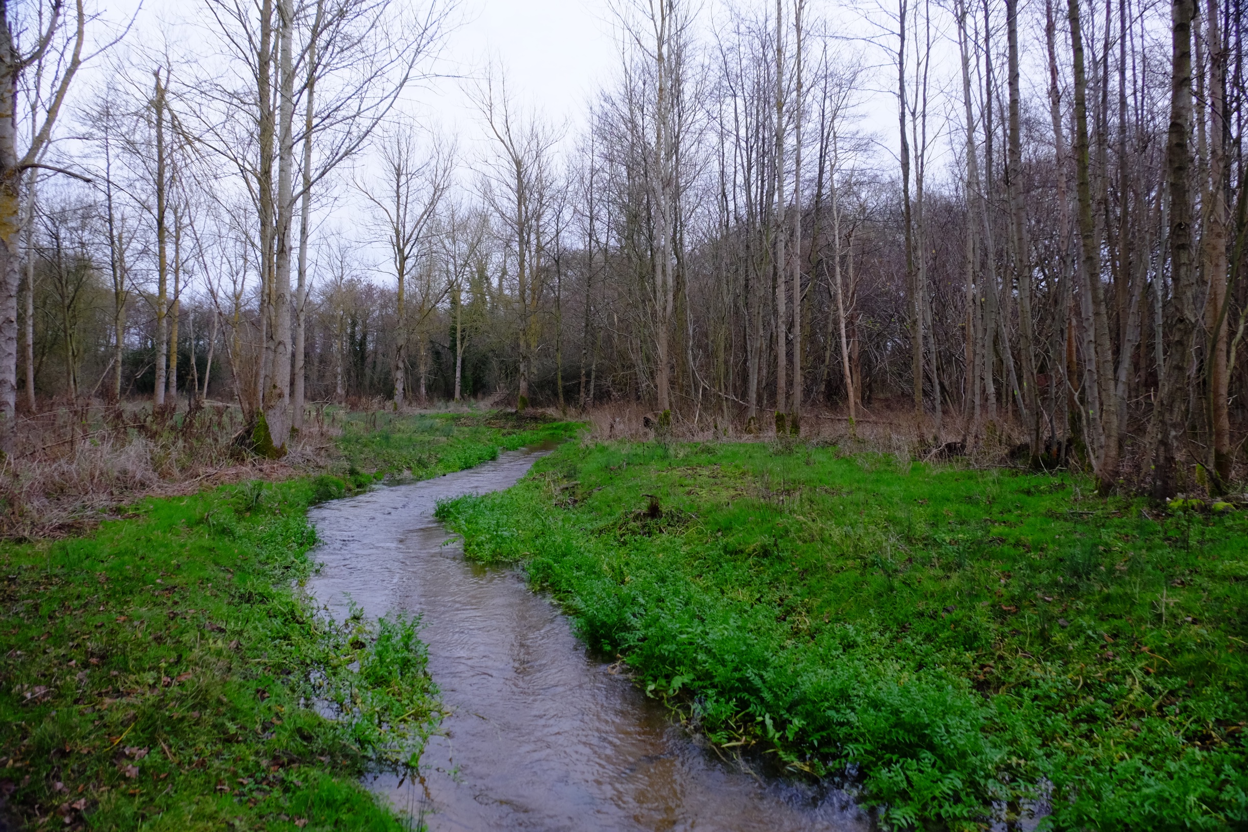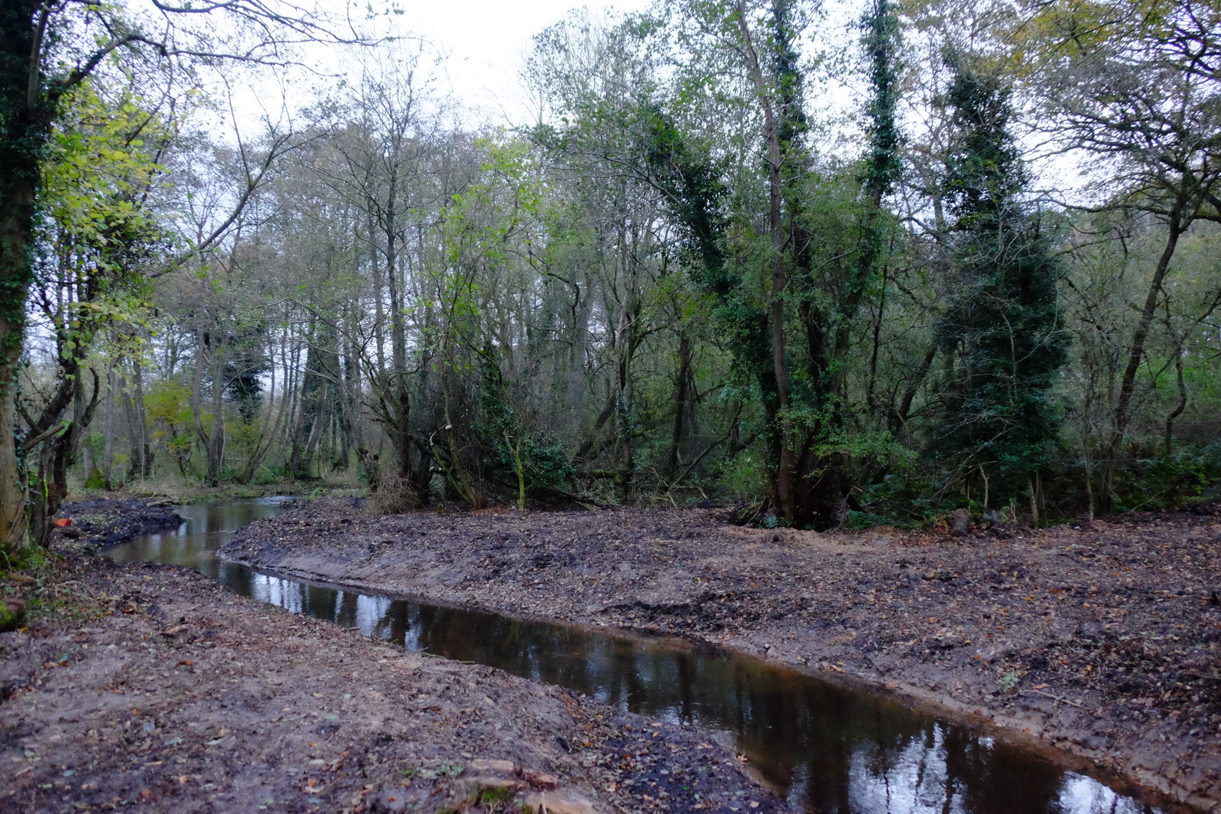 This is a brand-new river channel cut to connect a restored set of natural meanders with the main river. These pictures are taken more or less one year apart, immediately after the project was finished last winter and on 26th December 2015. The new channel is full of brown trout and all the in-stream and riparian plants – including good stands of ranunculus and starwort – are self-sown. For more details see the link at the foot of the page.